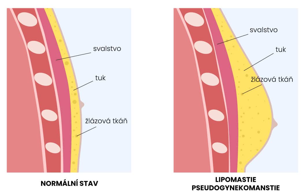 - Lipomastie (Pseudogynekomastie): Hrudník je měkký na dotek, bez tuhých útvarů. Hlavním viníkem je tuk.